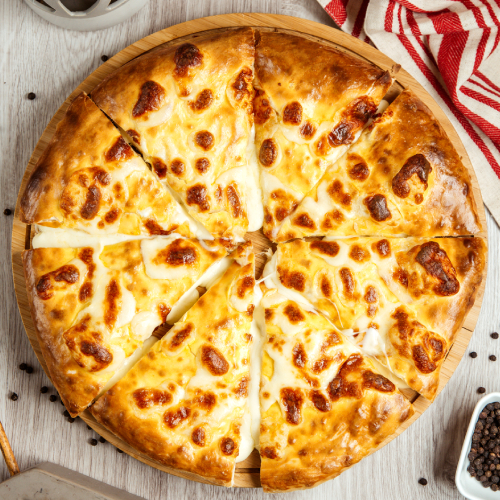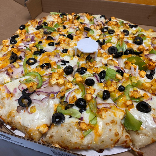 Creamy garlic sauce, Paneer cubes (lightly marinated), Onions, sweet corn, black olives, bell peppers, mozzarella, cheddar.