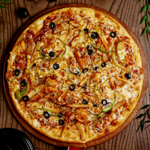 Creamy garlic sauce, Achari-marinated soya chaap, onion, capsicum, tomato, mozzarella