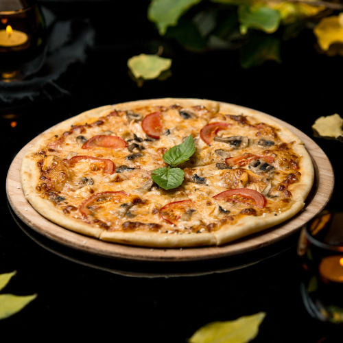 Creamy garlic sauce, Achari-marinated soya chaap, onion, capsicum, tomato, mozzarella