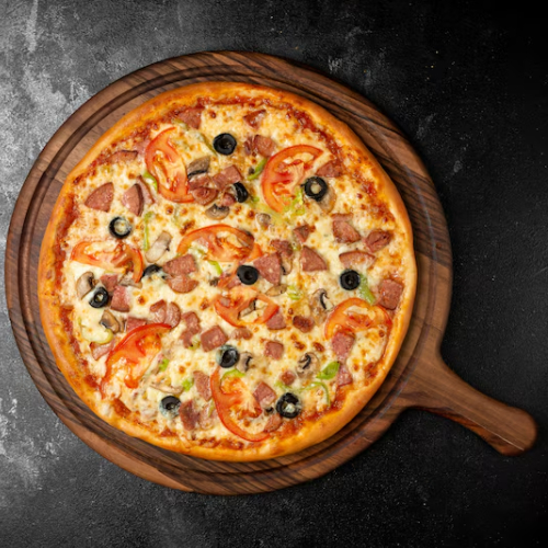 Tangy sauce, Mixed bell peppers, onion, tomato, corn, mushrooms, mozzarella